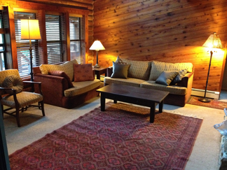 Four bedrooms have a queen bed and one has a king-size bed. The large bedroom also has a log-framed bunk bed. Two bathrooms and a separate vanity sink area provide plenty of personal space. There is an upstairs reading/game table area. Downstairs you will find a large flat screen and surround sound system with BluRay and Apple TV. There is internet and cell phone coverage.